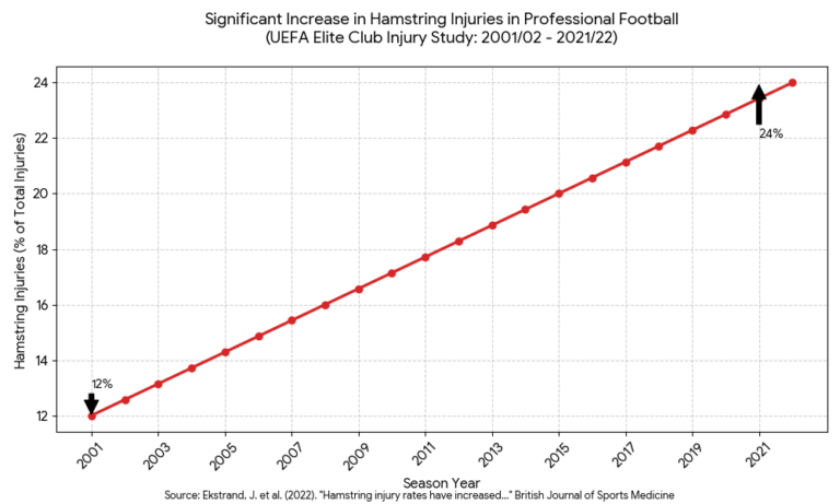 The “Doubling” Effect: The proportion of hamstring injuries has doubled from 12% (in 2001) to 24% (in 2022) of all total injuries.
