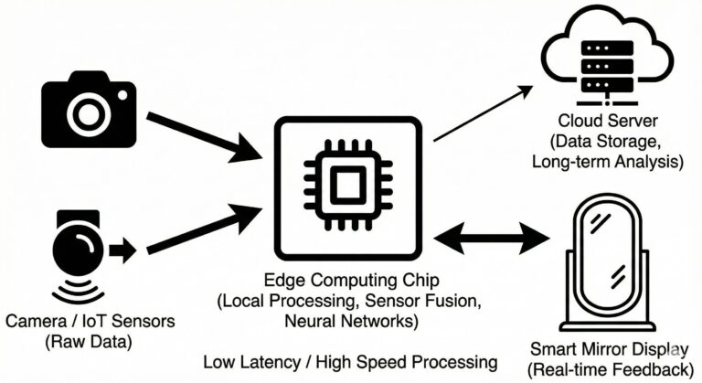To engineer a smart mirror and its connected IoT ecosystem, the system relies on a stack of Computer Vision algorithms, specifically Pose Estimation models (like Convolutional Neural Networks), which map the user’s skeletal joints in real-time to overlay Augmented Reality (AR) form guides on the glass. This visual data is synchronized with the IoT hardware using Sensor Fusion algorithms, most notably Kalman Filters, which mathematically “scrub” the noisy raw data from the accelerometer and gyroscope to create a smooth motion curve. To ensure there is no lag between your movement and the reflection, the system utilizes Edge Computing, processing these heavy Neural Networks locally on the device’s chipset rather than in the cloud, before transmitting the finalized performance metrics via lightweight MQTT messaging protocols.