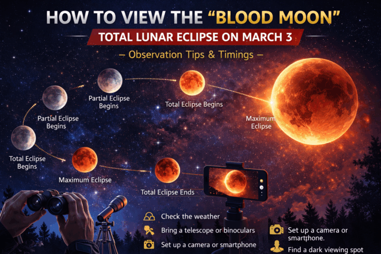 A rare celestial event is headed our way: a total lunar eclipse, popularly known as a blood moon, will occur on March 3. During this spectacular phenomenon, the Moon passes completely into Earth’s shadow, and as sunlight refracts through Earth’s atmosphere, it gives the Moon a reddish hue — earning the nickname blood moon.
