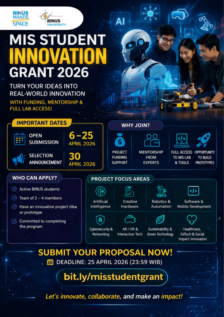 The Maker Innovation Space (MIS) BINUS University proudly invites all BINUS students to participate in the MIS Student Innovation Grant 2026. This program is designed to support students in transforming innovative ideas into real-world prototypes and impactful solutions.